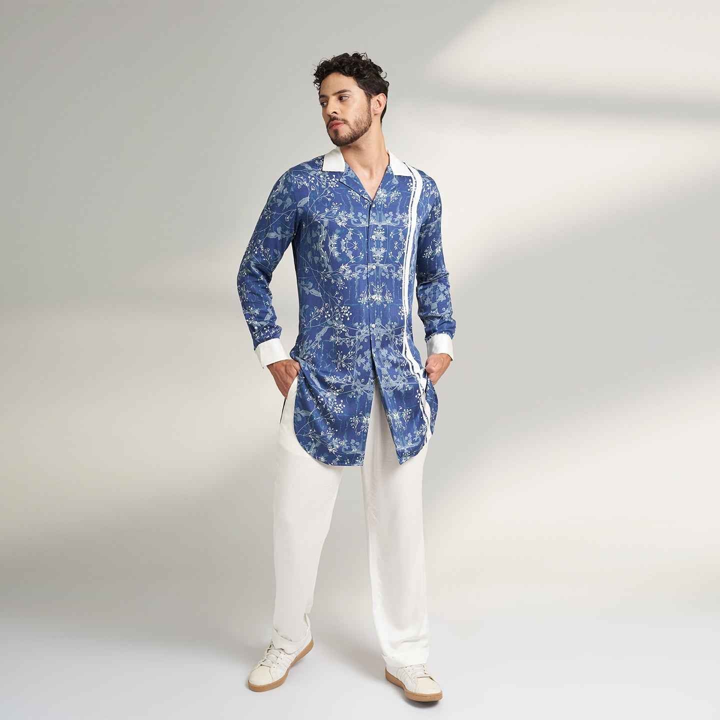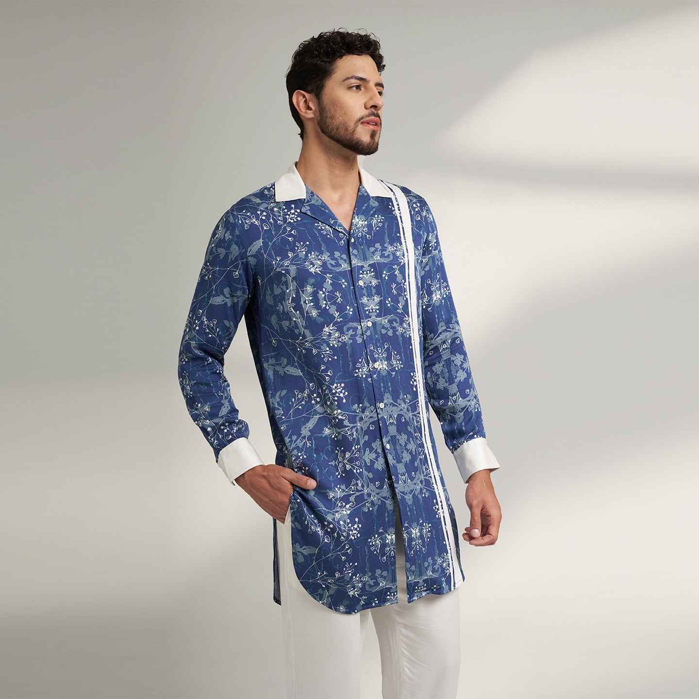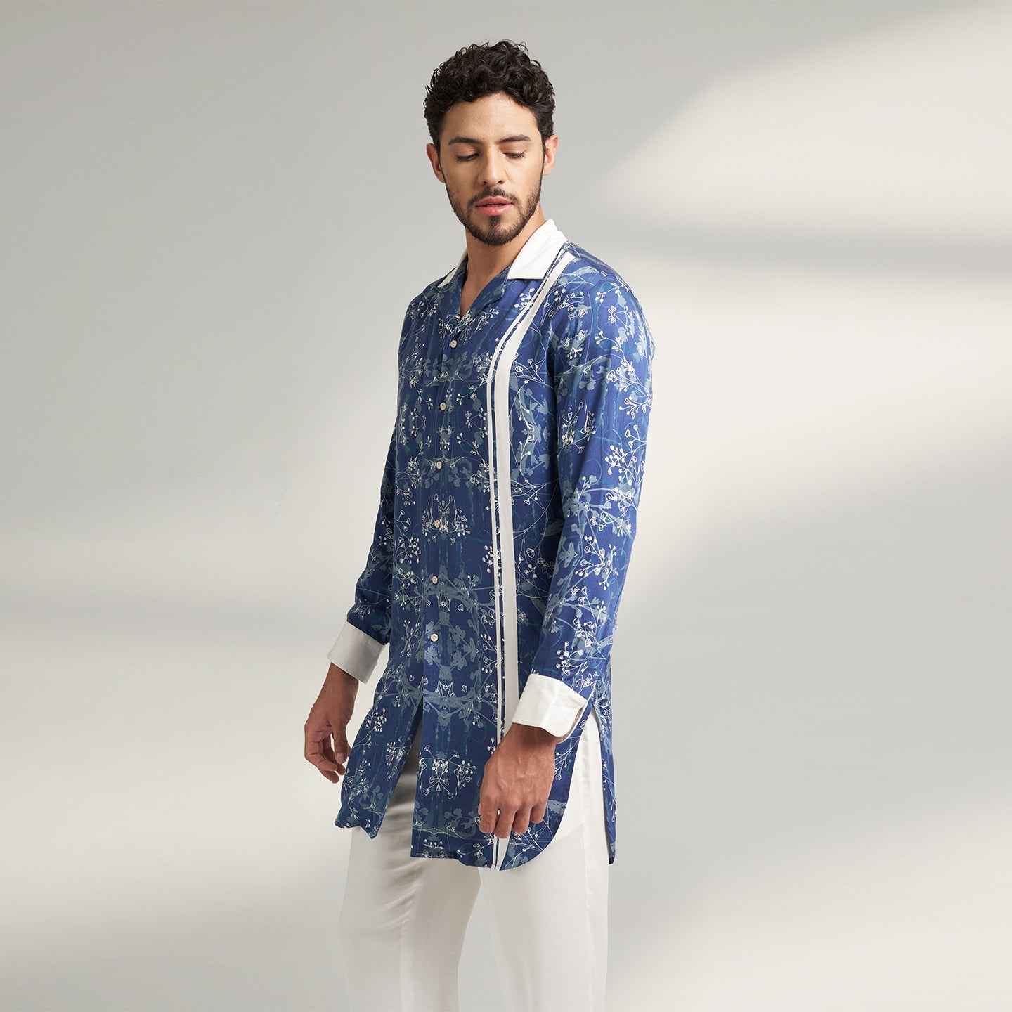 This Blue bitrus designer organic lotus fabric long shirt offers a contemporary take on a timeless piece. Crafted in soft and light lotus stem silk fabric, it features long length with cuban collar, accented by a contrast collar and cuff. The shirt features a delicate and understated floral print, accentuated by a single wide white stripe adorning the left panel. This detail serves as a captivating highlight for any evening occasion. Thanks to its comfortable fit and long length, the shirt will pair easily with any pants to put together an elegant yet comfortable outfit.